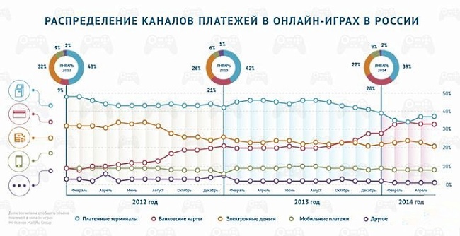 На первой позиции среди всех каналов по платежам в большинстве российских онлайн-игр, как и годом ранее, продолжают оставаться платёжные терминалы, в то же время за несколько последних лет расчёты с использованием банковских карт продолжают наращивать объёмы. Динамика роста с 2012 по 2014 продемонстрировала троекратный прирост.
